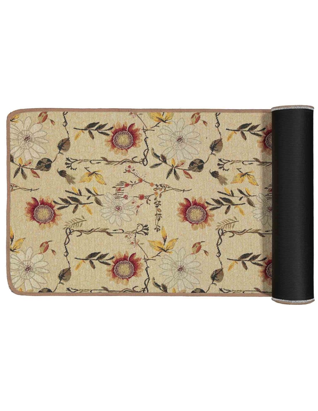 Una base naturale su cui sono adagiati girasoli e altri fiori tra rametti e foglie, non stampato ma creato con la lavorazione jacquard per una primavera eterna in casa tua..