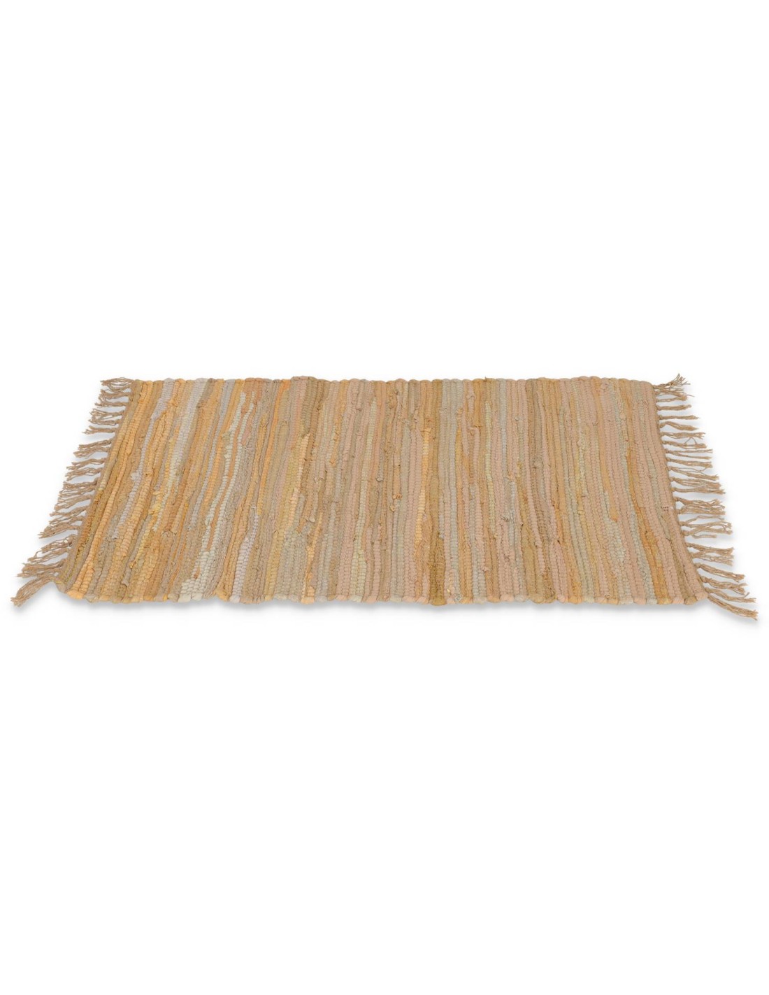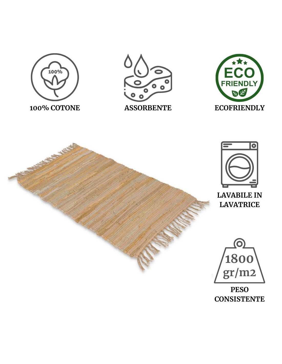Creato da lingue di tessuto assemblati con un abile intreccio di fili a formare un tappeto senza antiscivolo ma dal buon peso..