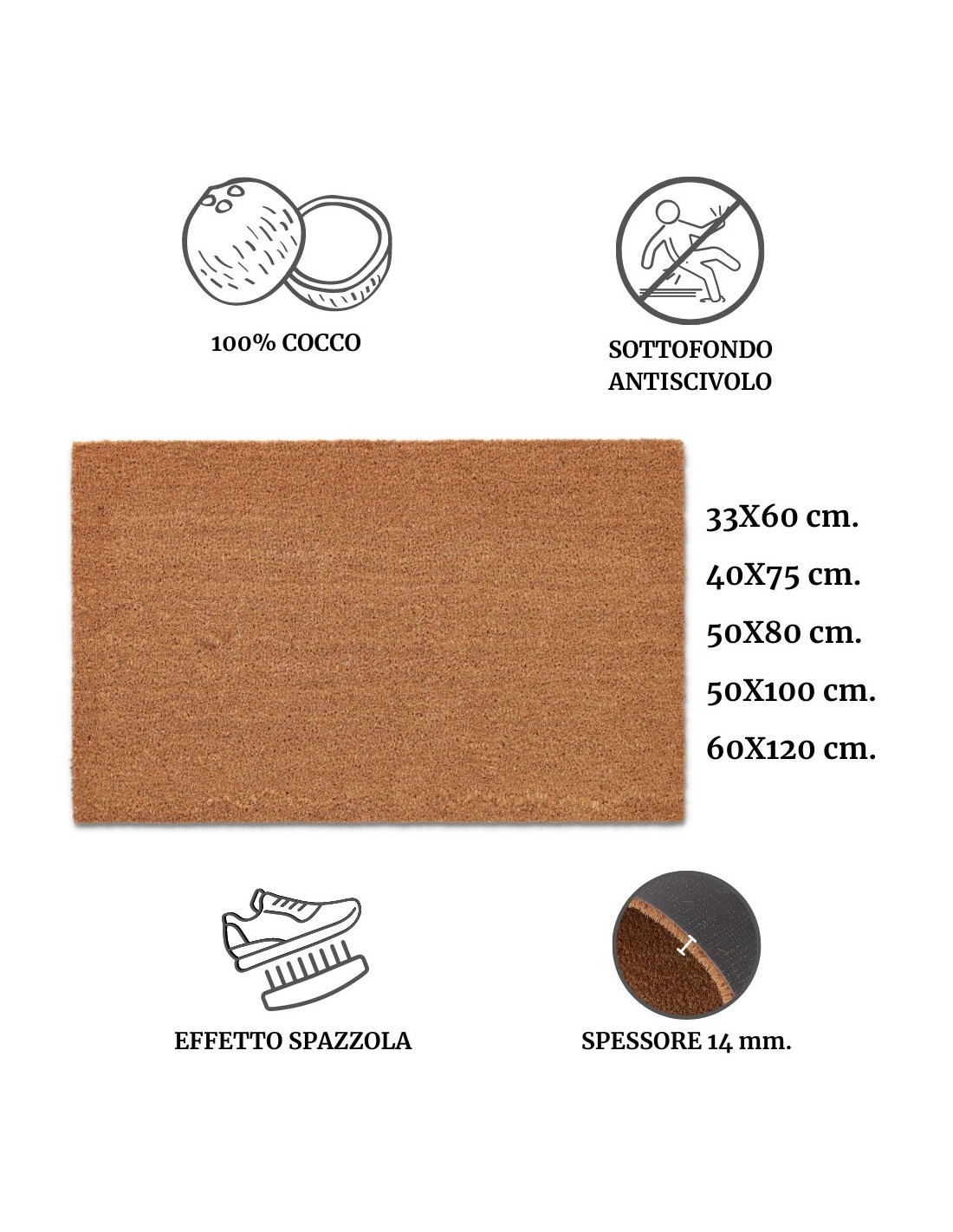 CARATTERISTICHE: Creato con fibra di cocco naturale accoppiato a un fondo vinilico antiscivolo, blocca le fibre di cocco e lo rende stabile e fermo a terra..